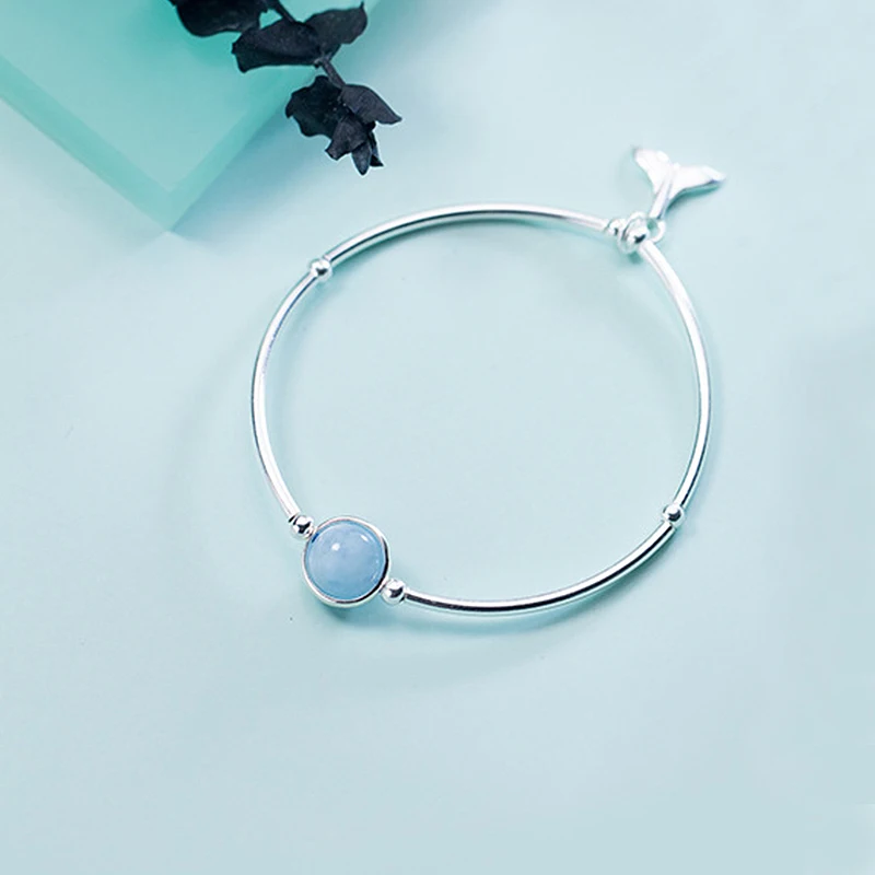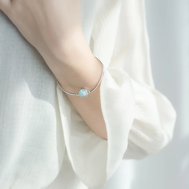 Un bracelet en argent à la simplicité exemplaire puisqu’il renferme une pierre d’aigue marine, symbole porte-bonheur de santé qui apporte un bel équilibre sur les plans physiques et mentaux. Une breloque qui ne souhaite que ton bien car rien n’est plus important une bonne santé.